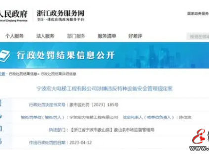 2023年4月12日,浙江省象山縣市場監(jiān)督管理局對寧波宏大電梯工程有限公司涉嫌違反特種設(shè)備安全管理規(guī)定案進(jìn)行行政處罰。[詳情]
