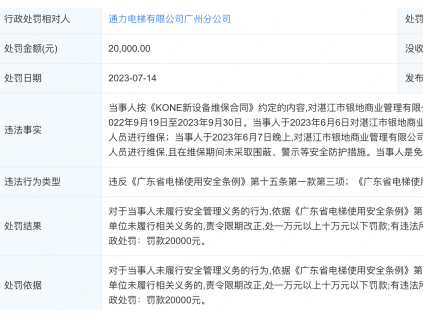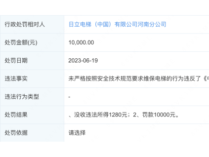 因為沒有嚴格按照安全技術(shù)規(guī)范要求維保電梯,日立電梯(中國)有限公司河南分公司于2023年6月19日倍鄭州市金水區(qū)市場監(jiān)督管理局罰款1萬元嗎,并且沒收違法所...[詳情]